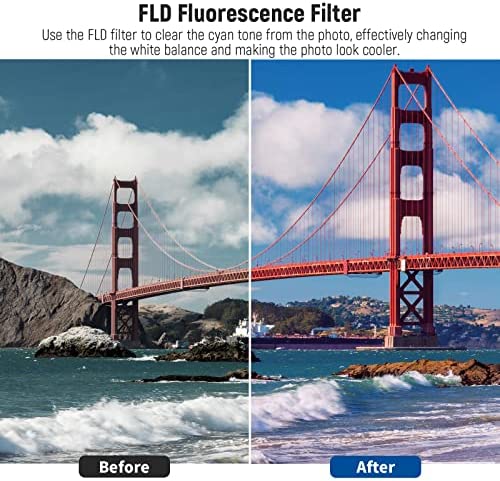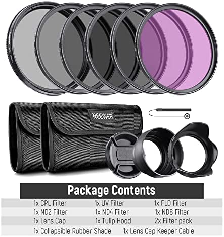 The NEEWER lens filter kit includes a UV filter to protect your lens from scratches, dust and dirt, as well as a CPL filter to reduce reflections and glare and enhance color saturation. The kit also includes an FLD filter to correct artificial lighting and a set of three neutral density filters (ND2, ND4, ND8) for long-exposure photography.